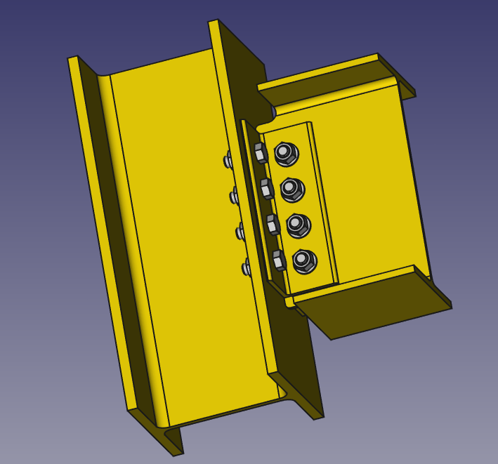 A simple assembly of a structural beam connection, with duplicates of multiple types of fasteners. The Bill of Materials too can be used to count the number and type of scews, washers, and nuts used.
