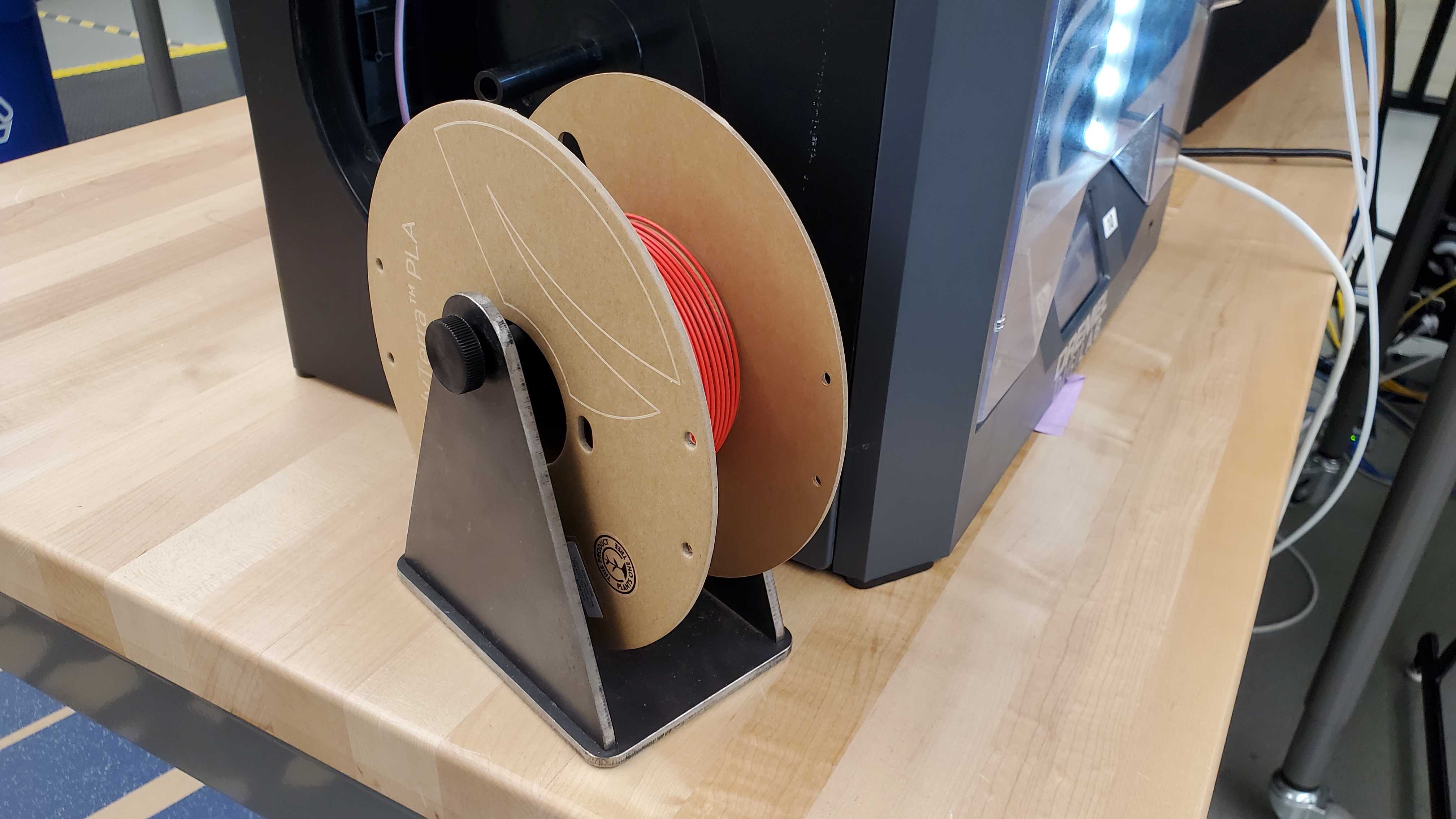 at {dayjob}, I ended up in charge of a small fleet of Dremel Desktop FDm 3D printers. These machines, by default, work with a proprietary size of filament spool with a built in RFID chip. I decided to switch to using a generic PLa filament to save on material costs and sourcing headaches. Unfortunately, the new style of spool didn’t fit into the built in compartment in the printers’ enclosure. To get around this problem, I designed and build a set of spool-holders.