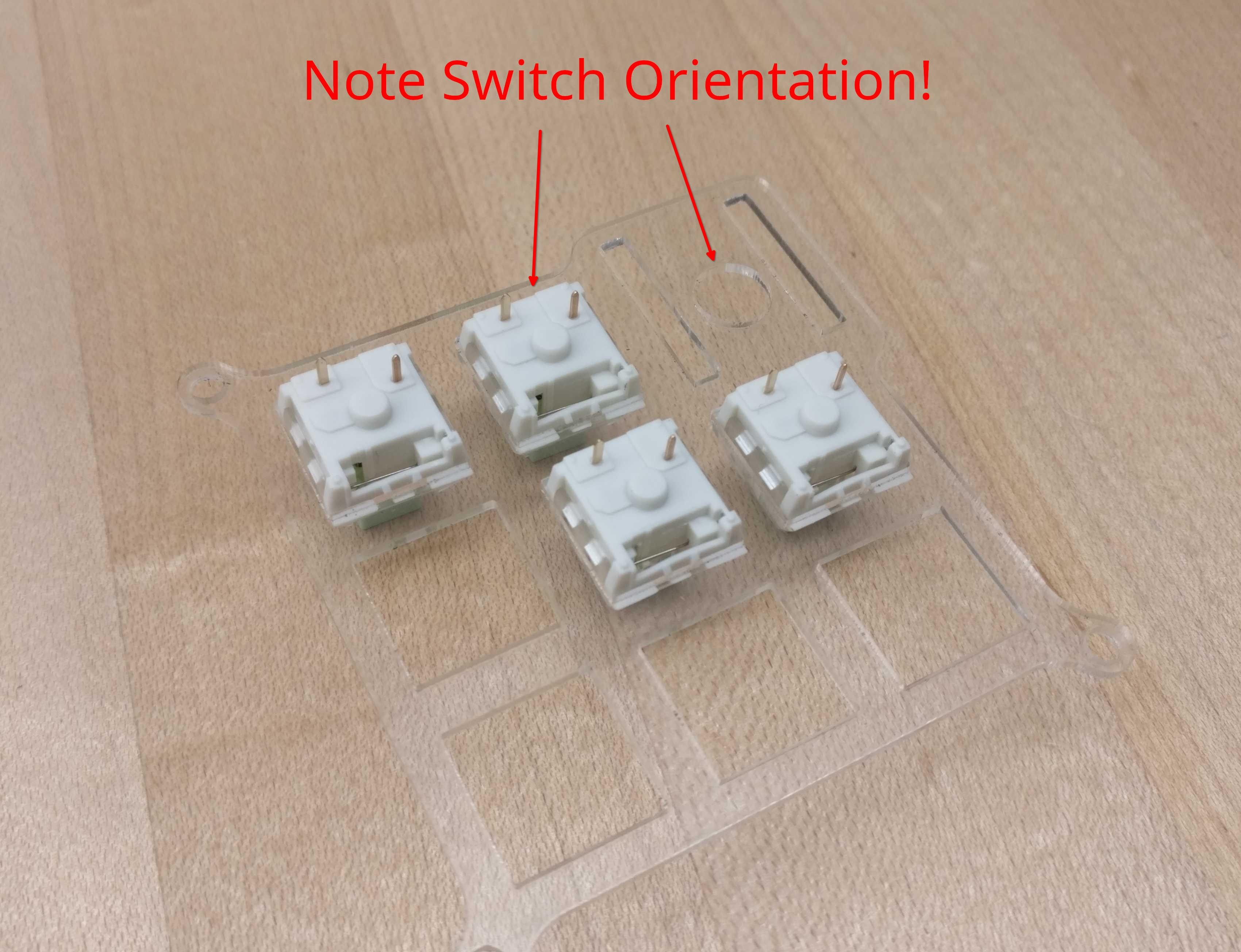 At this point, you should have a case and an acrylic plate. Let’s get it all assembled! First, press the switches through their matching holes in the acrylic plate. Make sure to remove the protective film from the acrylic before adding the switches. The holes are square, so you’ll need to get each switch in the correct orientation.
