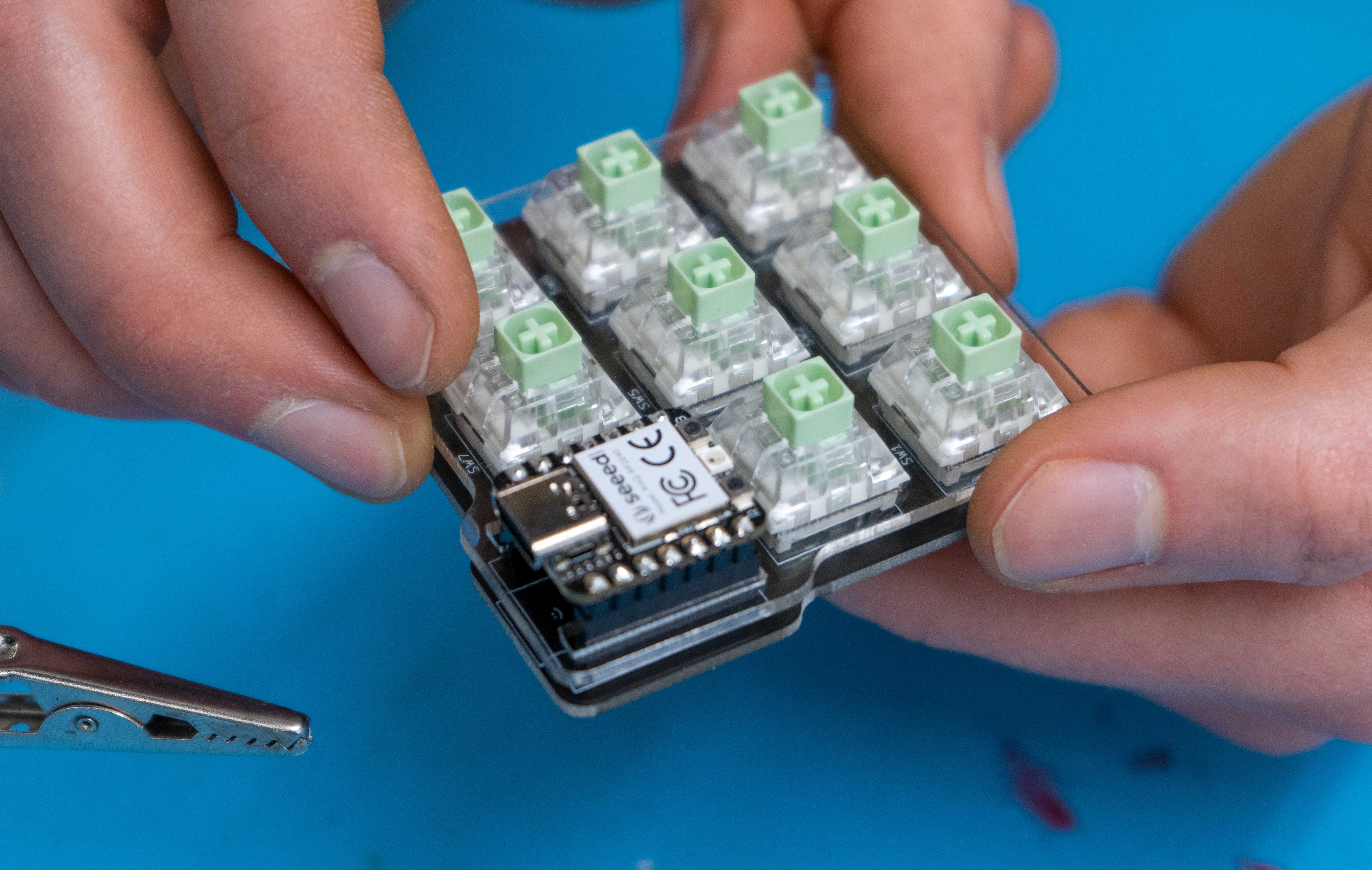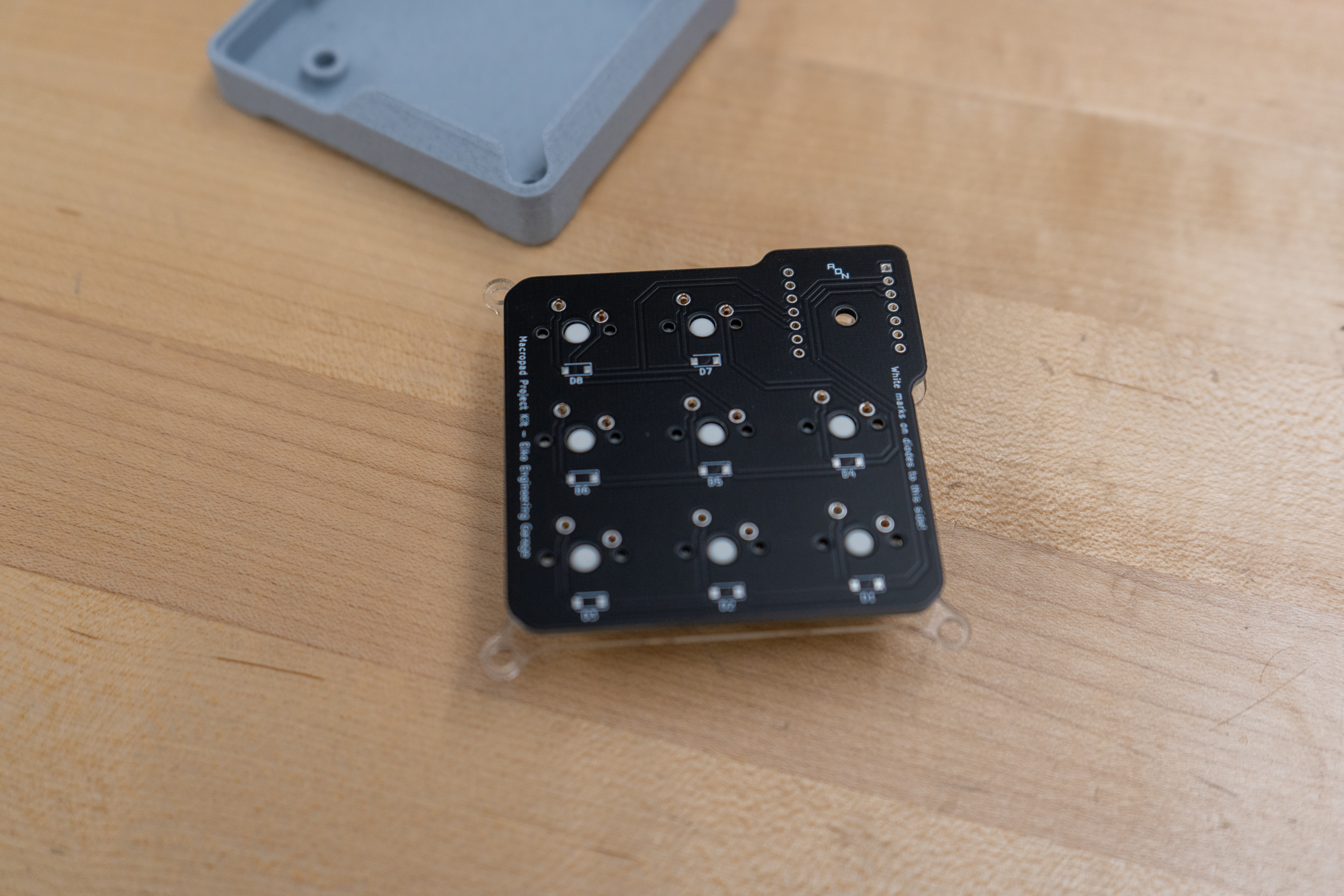 Slot the entire MCU sub-assembly through the acrylic plate and into the PCB (facing upwards, like the switches) and solder the sockets of the MCU and the key switches to the main PCB.
