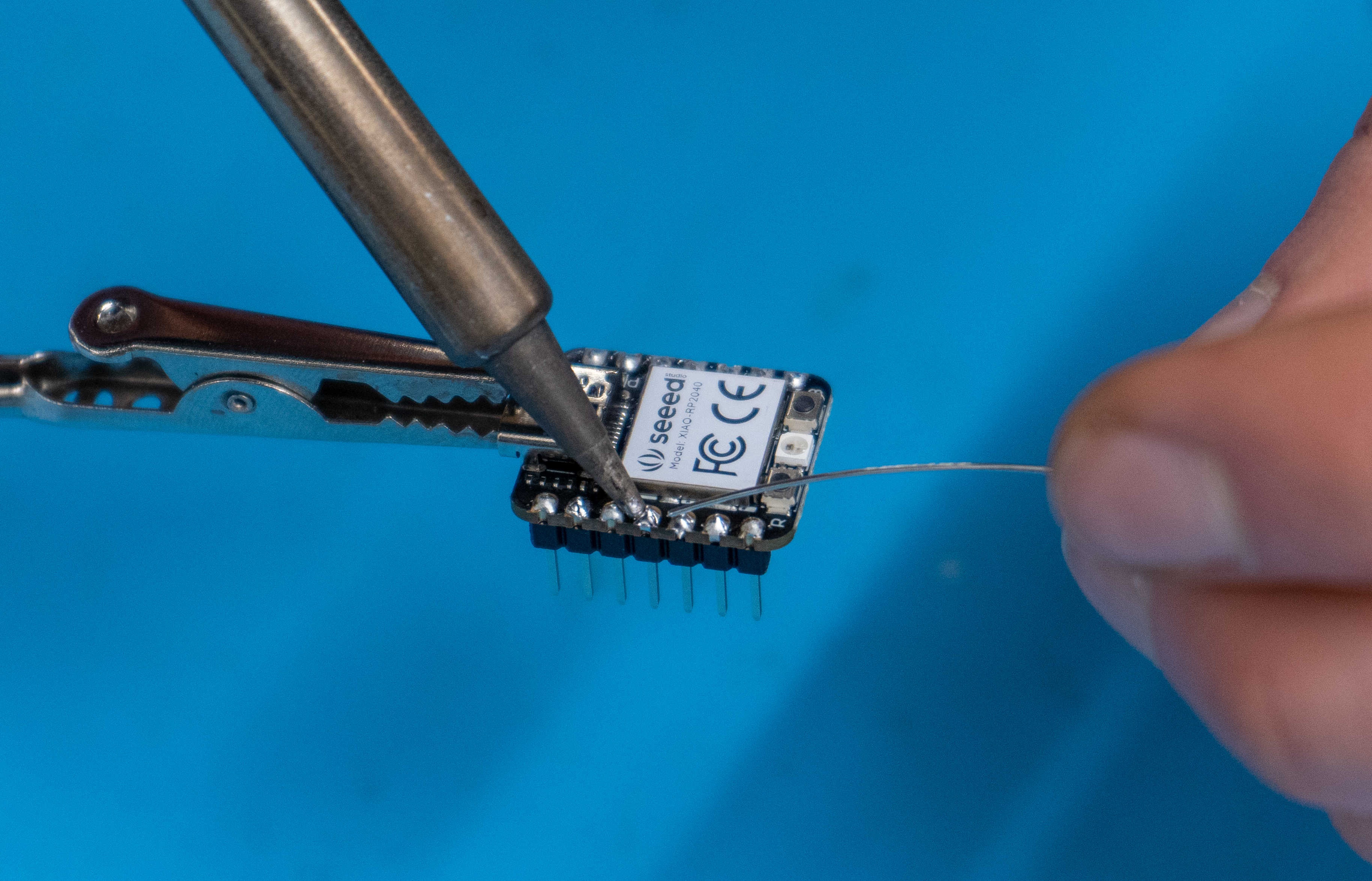 Next, you’ll need to prep the micro-controller (MCU) for assembly. Take it out of it’s package and push the pin headers into the two rows of holes in the board. The shorter leads on the pin headers go up into the micro-controller, and the longer sets of leads stick down to connect to the other parts of the assembly. Solder each of the leads on the pin headers to the MCU. We aren’t connecting most of the pins to anything electrically, but soldering them all adds a bit of mechanical strength.